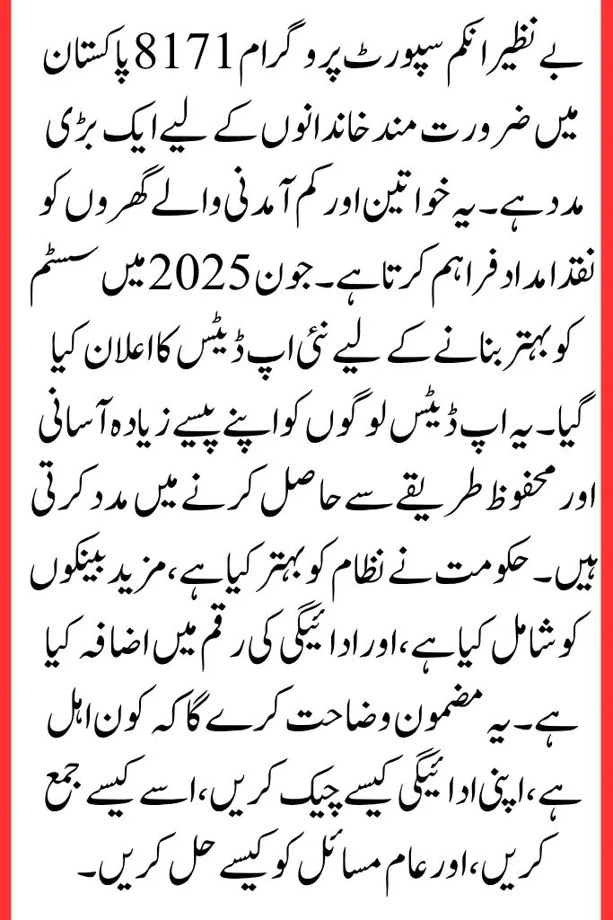 بے نظیر انکم سپورٹ پروگرام 8171 پاکستان میں ضرورت مند خاندانوں کے لیے ایک بڑی مدد ہے۔ یہ خواتین اور کم آمدنی والے گھروں کو نقد امداد فراہم کرتا ہے۔ جون 2025 میں سسٹم کو بہتر بنانے کے لیے نئی اپ ڈیٹس کا اعلان کیا گیا۔ یہ اپ ڈیٹس لوگوں کو اپنے پیسے زیادہ آسانی اور محفوظ طریقے سے حاصل کرنے میں مدد کرتی ہیں۔ حکومت نے نظام کو بہتر کیا ہے، مزید بینکوں کو شامل کیا ہے، اور ادائیگی کی رقم میں اضافہ کیا ہے۔ یہ مضمون وضاحت کرے گا کہ کون اہل ہے، اپنی ادائیگی کیسے چیک کریں، اسے کیسے جمع کریں، اور عام مسائل کو کیسے حل کریں۔
